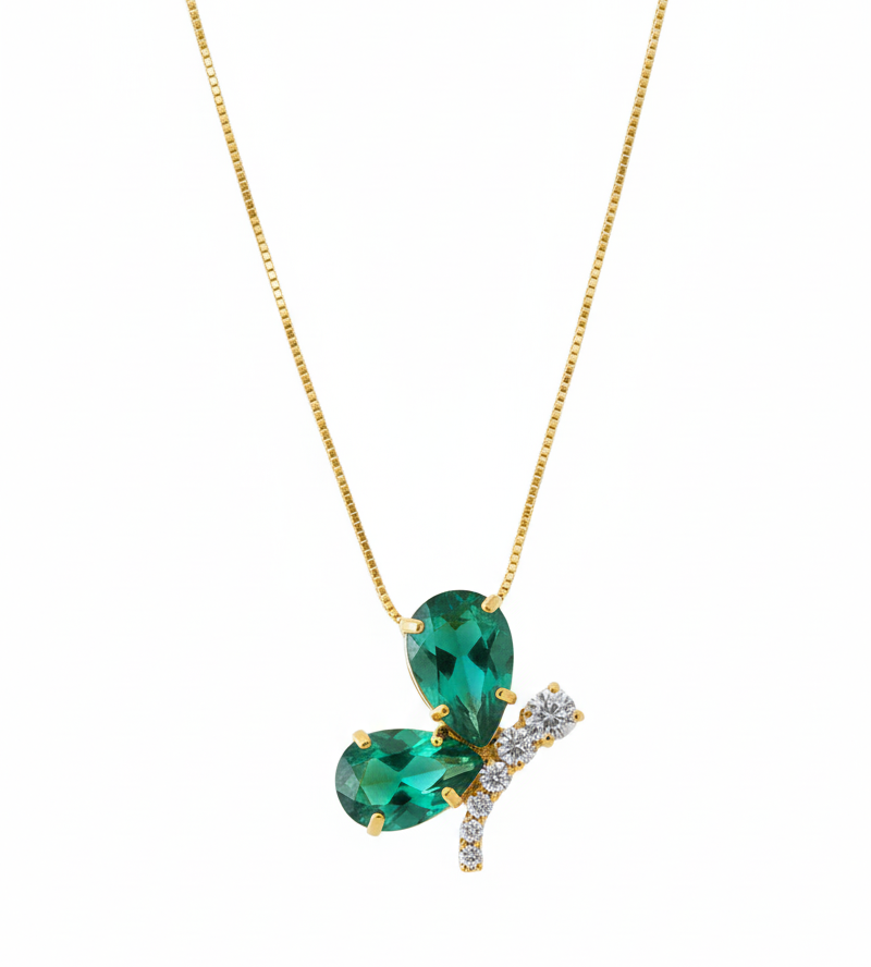 Corrente com pingente de borboleta pedra verde escuro e corpo cravejado zircônia cristal (BANHADO A OURO 18K)